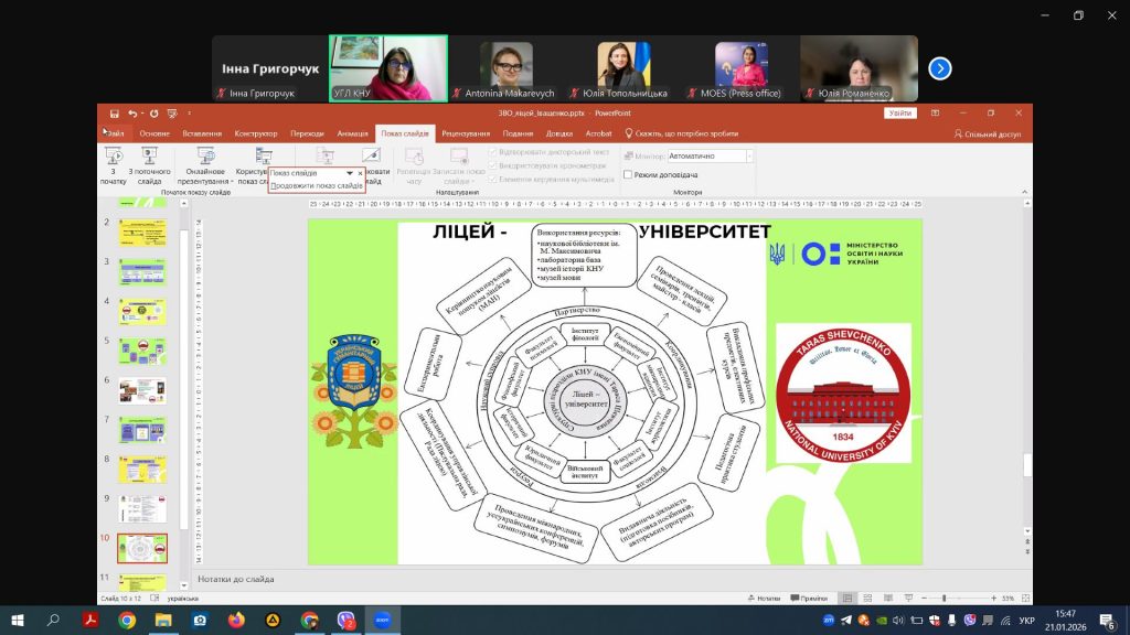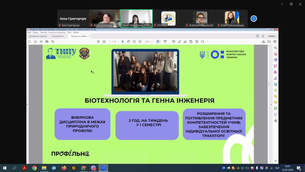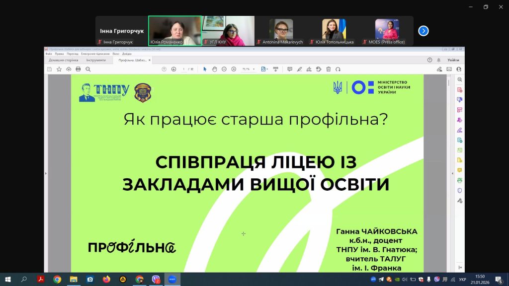 21 січня 2026 року викладачі кафедри біології та екології Кам’янець-Подільського національного університету імені Івана Огієнка взяли участь у вебінарі «Співпраця академічних ліцеїв із закладами вищої освіти», присвяченому обговоренню сучасних моделей взаємодії між закладами загальної середньої та вищої освіти.